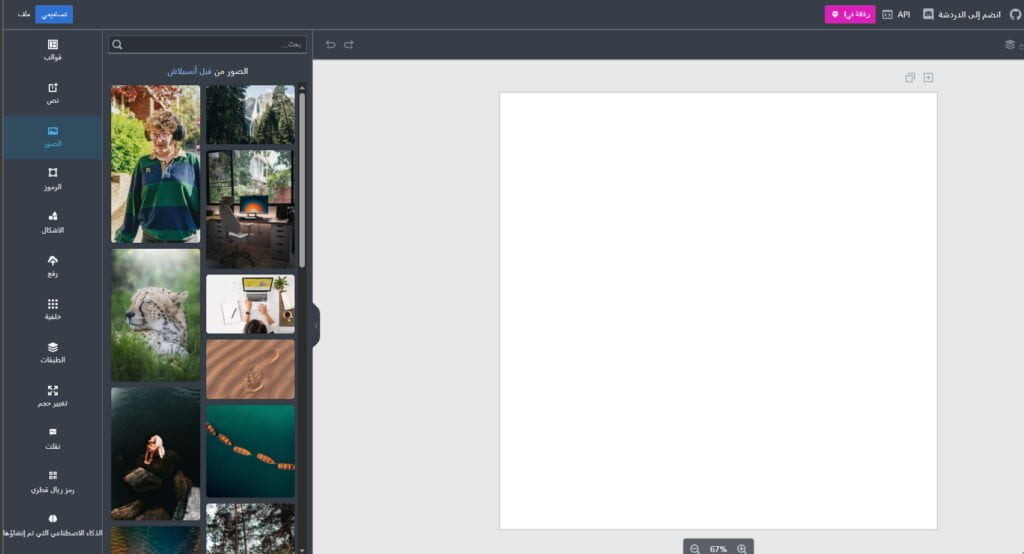 - يوفر الموقع مجموعة متنوعة من الأدوات والميزات التي تتيح لك إنشاء تصميمات ذات مظهر احترافي، ويتضمن ذلك محرر نصوص وأداة شكل ومدير طبقات والمزيد.