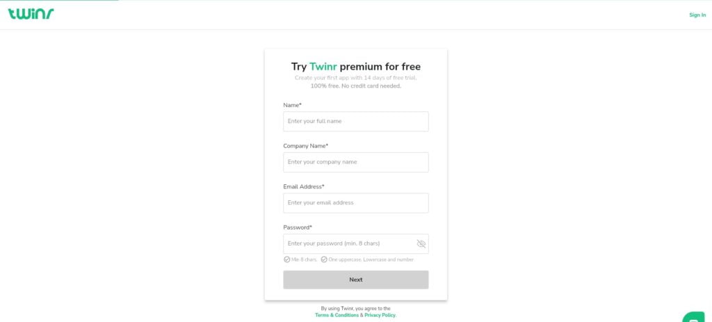 ويمكنك تجربة مجموعة ميزات Twinr الكاملة مع نسخة تجريبية مجانية مدتها 14 يوم، ولا يلزم وجود بطاقة ائتمان، استفد من هذه الفرصة إلى أقصى حد لاختبار النظام الأساسي قبل اختيار الخطة المناسبة لك.