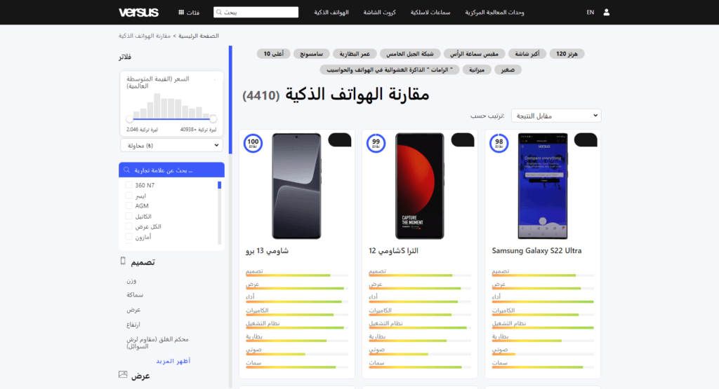 وبواسطة موقع فيرسوس يمكنكم مقارنة الهواتف الذكية لأشهر الماركات العالمية مثل شاومي وسامسونج وايفون وغيرها وذلك من خلال التصميم والعرض والكاميرات ونظام التشغيل والبطاريات والسمات الرئيسية لكل هاتف.